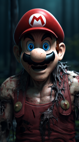 Game character super mario as a zombie, in the background a creepy horror forest, realistic image, insane details, Ultra-HD, --ar 9:16