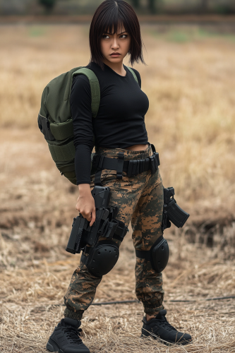 Please draw a real fullbody portrait of a beautiful brown skin thai woman with black short hair, bangs and long side burns, black long sleeve shirt, camo jogger pants with black knee pads, black military shoes, wearing a green backpack, a black and gold belt, black weapon holsters around thighs. She is standing off looking serious with a strong face holding her pistols down by her side in front of a field background --ar 2:3 --no makeup --v 6.0