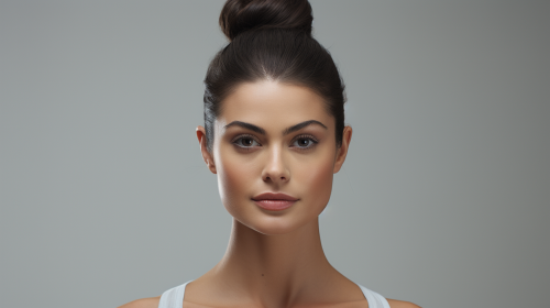 medium shot of a brunette girl bun hair, looking straight, natural light, real light, real, realistic, ultra-detailed 8k image light grey studio background, iso 200, modern, minimal, asymmetrical balance, long exposure, highly detailed, UHD, HDR, Sony A7 Siii, HD Lens High Definition, Soft color, soft image, soft colors inspirational, 4K --ar 16:9 --s 250