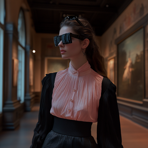 A realistic photo of a brunette walking in a museum in Amsterdam. She is wearing a pink blouse and a black sweater and a pair of sunglasses. The camera angle is at 40 degrees.