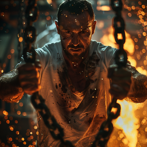 A brutal, pumped-up man in a white T-shirt pulls two large chains,, the character looks into the camera, the character is clearly visible, the character in the foreground, brutal facial expression, brutal male smile, epic photo, particles, sparks, fire, contour light on the character, full-length photo, hands are fully visible, cinematic lighting, professional photo, poster --v 6.0 --s 250