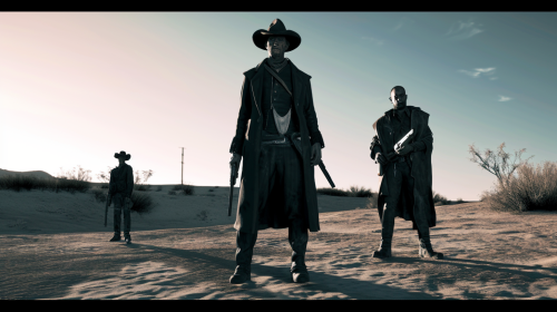 Craft a highly detailed modern digital movie still depicting a enigmatic gunslinger from a 19th-century American Southwest narrative. He is portrayed by an actor with a crazy look of a cowboy killer. The frame is reflecting his journey through a world of brutality and death. Alongside him, feature two other characters: one, a larger-than-life, ominous figure casting a shadow over the scene, and the other, a seasoned, weathered individual with a hint of underlying savagery. Capture this scene through the lens of an ARRI Alexa camera, utilizing its rich color rendering and dynamic range to emphasize the vivid, saturated colors of the desert landscape contrasted with the deep, shadowed expressions of the characters. The cinematic style should blend stark, sun-baked expanses with the intense, focused lighting on the characters, highlighting their complex interplay and the harsh environment that surrounds them. They are heartless killers holding weapons. The image should show a sense of fear and tragedy.. --aspect 16:9 --style raw --s 5 --v 6.0