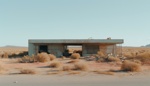 a 1970s brutalist concrete building, in the australian outback, wes anderson framing, flat plain, wide angle, flotsam and trash scattered about --ar 7:4