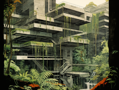 70s grainy illustration. a large brutalist building by Lina Bo Bardi. Inside a thick rainforest. --ar 4:3