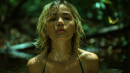 zoom out 2x, low angle camera view of full body, Juliane with short blonde hair, dark green sun dress, in the Amazon rainforest. Her face shows a mixture of bewilderment and detachment. Eyes unfocused, staring into middle distance. Slightly parted lips, as if on the verge of speaking. Disheveled hair with leaves and twigs tangled in it. Skin dirty and scratched, with a sheen of sweat. Dark circles under her eyes suggest exhaustion. 3D. High detail on Juliane's face, capturing every nuance of her bewildered expression. --ar 16:9 --v 6.0 --s 750 --style raw --chaos 30