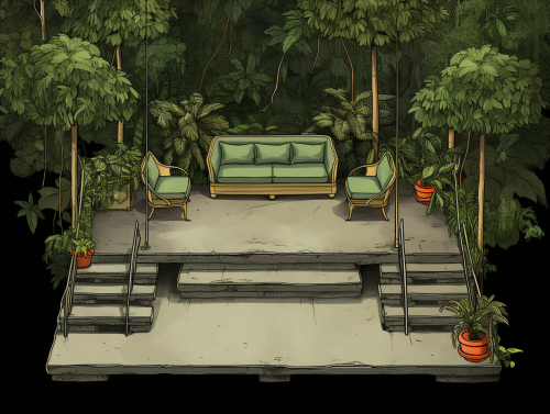 grainy illustration. two sofas 15 meters above the ground on an elevated concrete platform in the middle of a rainforest. the platform is 15 metres from ground level. this platform is completely open on each side, it is just a platform. concrete steps provide access to the platform from below. the platform is surrounded by tropical plants. viewed from above --ar 4:3