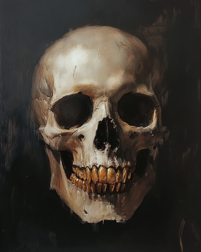 Rembrandt's painting depicting front view our subject looks down at us, portrait of a skull with gold teeth towering over us with a strong jaw, looking serious but relaxed, very realistic image and dramatic lighting deep blacks --ar 4:5