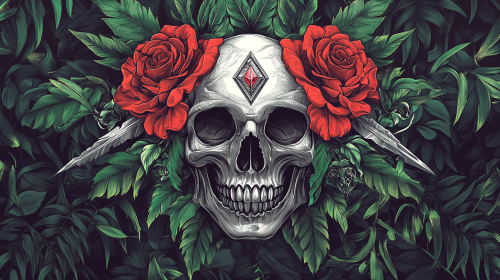 tatoo art,A detailed illustration featuring a skull at the center, adorned with vibrant red roses and silver swords. The skull has a prominent grin and is embellished with a diamond shape on its forehead. Surrounding the composition are green leaves, adding depth and contrast to the bold colors and intricate patterns.tatoo art --ar 16:9