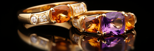 skull with golden crown with purple jewelery, photorealistic, gold background, real gold looking, crown covered of purple diamonds and gems, made only gold and purple colors