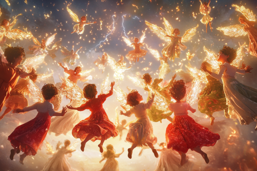 3d CGI animated image of the sky filled with light beings in the shape of angels shining down as they send light to children, who are dancing and singing with joy, restoring light to the world, very detailed, bright colors, childrens book image, cinematic lighting, --ar 3:2