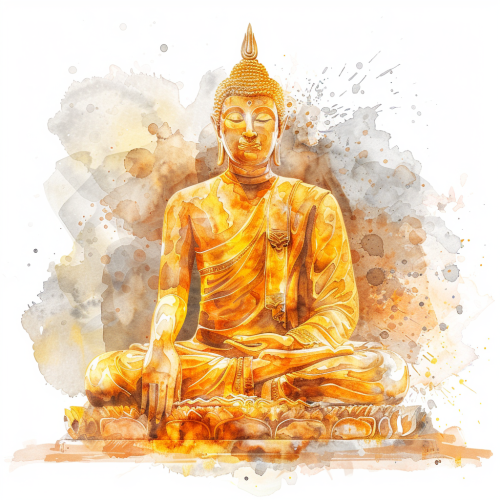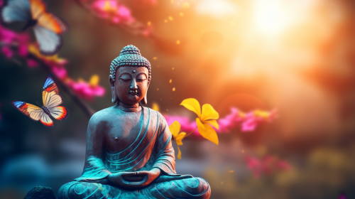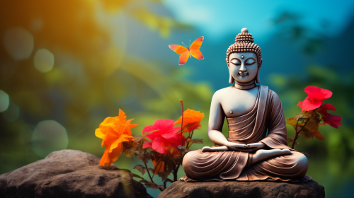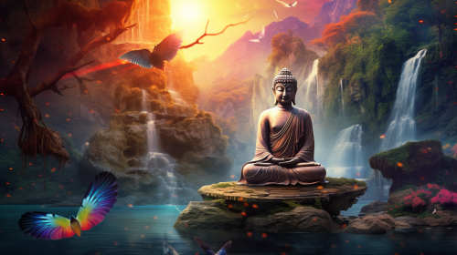 high resolution image, vivid colors, bright luminous scene, a buddha statue in a beautiful natural landscape, two beautiful colorful little birds flying around it --ar 16:9
