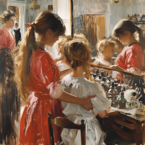 : a colourful skull girl brushing her hair in front of a mirror in a manga-style