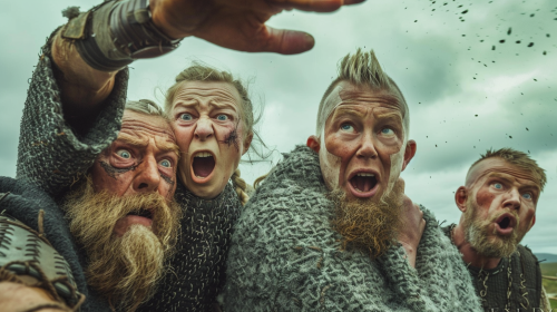 From a point of view of an old woman that WE NEVER SEE, she is slapping the faces of three 3 viking acting shocked and curious, they are looking directly at the camera, her hand sweeping across the frame, one has abrown beard, one a blond beard the otehr has none, the sky is overcast behind them, in slow motion so their faces are being pushed and it looks funny, their mouths out of wack, so spit flying, we only see her arm taht is covered in grey wool --no text --ar 16:9 --style raw --v 6.0