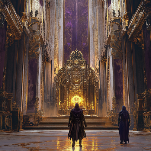 A surreal gothic horror scene in a dreamlike atmosphere where the character from the provided image is walking up to a grand throne room made entirely of marble. The room is filled with ornate wall hangings and tapestries of gold and purple, creating a regal and eerie ambiance. At the end of the room, a tall and proud golden throne sits on a raised dais, gilded with platinum. Resting on the throne's seat is a golden crown, set atop a soft violet pillow and adorned with priceless gems that sparkle faintly in the dim light. The player character, a figure wearing heavy furs and leather armor with a hood pulled low, walks slowly toward the throne. In one hand, they hold a small flame conjured from their fingertips, while their bow and arrows are slung across their back. The character's expression is calm yet determined, as if they are aware of the power and danger surrounding them. Beside the throne, Zantras the Kingmaker stands tall on the dais steps, watching the character approach. He is slender and handsome, wearing deep blue and black robes, with a simple sheathed dagger at his side. His presence is regal but unnerving, as though he belongs both to this world and beyond it. The overall scene exudes a gothic, haunting atmosphere with a blend of elegance and foreboding, as the character approaches their destiny.
