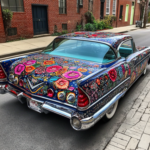Crie uma imagem realista de um Cadillac Coupe De Ville de 1959 com uma pintura exterior que imita o design de um tapete de Arraiolos. O carro deve exibir os padrões detalhados e as cores vibrantes tÃpicas dos tapetes de Arraiolos, incluindo elementos florais e geométricos tradicionais. Posicione o carro em um ambiente elegante e atemporal, como uma rua clássica ou uma garagem vintage, para complementar o estilo retrô do veÃculo. Certifique-se de que a textura e os detalhes do tapete estejam visivelmente integrados na superfÃcie do carro, destacando a fusão entre o design automotivo e o artesanato tradicional no meio de uma cidade americana no anos 60