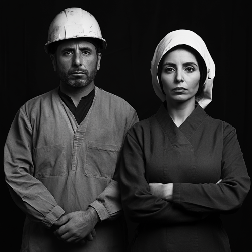 Front image of a builder Moroccan man and european architect woman with their hands folded, wearing builder's clothes with helmet black and white photo, clean and sharp lines