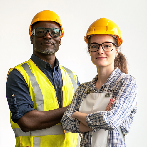 Front image of a builder african man and european architect woman and behind them other group of profesional workers in the construction with their hands folded, wearing dirty builder's clothes with helmet black and white photo with light background of building under construction with crane and other workers, clean and sharp lines