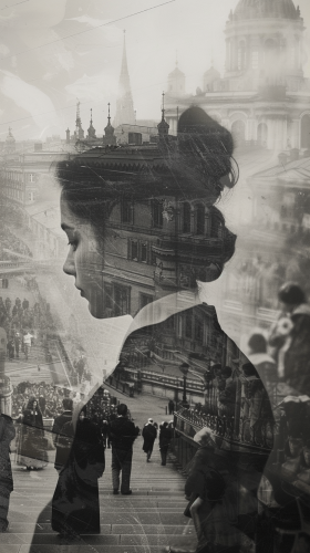 double exposure of crowded Saint Petersburg with poor student and young lady from XIX century --ar 9:16 --v 6.0