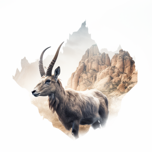 Double exposure photography of an ibex and desert mountainous cliffs, sharp focus, white background, double exposure photography