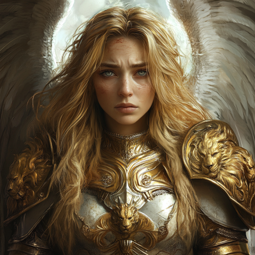 Weary and scarred Archangel war veteran, about 30 years old. She has massive white wings, long blonde hair, and bright blue eyes that have a soft glow. She has a heavily scared face. She looks like Kate Winslet. She is wearing golden lioness-motif Renaissance armor. Epic. Dark Fantasy. Baroque style.