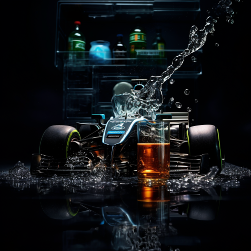 photorealistic formula 1 car driving through liquid being poured out of liquor bottles, high detail, all black background, spot light