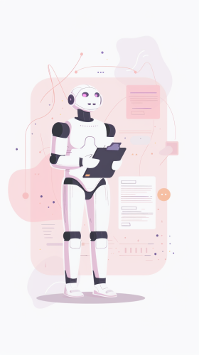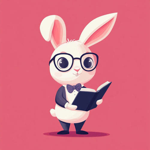 Cartoon flat illustration of a full body bunny with a bow tie and glasses holding a book on a pink background in a flat illustration style with clean lines. The work uses vector graphics and a simple design with a minimalist cartoon style aesthetic.