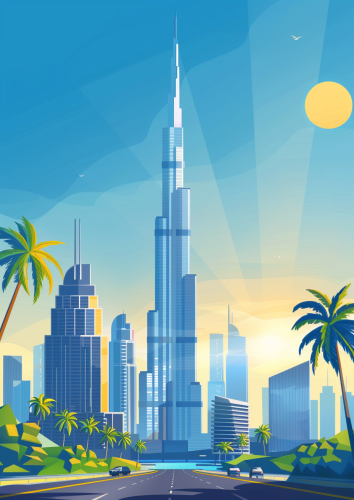 Dubai & Burj Khalifa, flat illustration, sunny day, not too complex, modern, 4k, epic composition, flat vector art illustration, long shot --no text, fonts, letters, words, watermark --ar 5:7