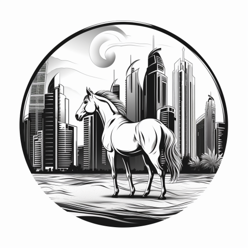 dubai city buildings, black and white, dunes, horse, logo, design, graphic, medal