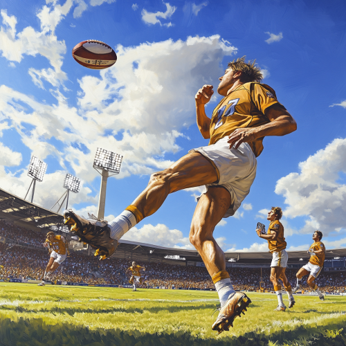 Australian Rules Football star Jack Ginnivan of the Hawthorn Hawks booting a game winning goal from outside the 50 meter arc against the Western Bulldogs. Photorealistic. No text.