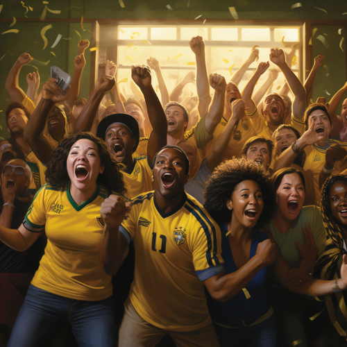 Young football team celebrating after a goal: The image captures a group of young boys and girls, aged around 8-10, wearing matching football jerseys in vibrant colors, joyfully celebrating a goal on a local football pitch. The kids are huddled together, some with arms raised in victory, while a coach in a tracksuit claps from the sidelines. The pitch is set in a typical Polish schoolyard or community sports field, with a simple wire fence, a small audience of parents cheering, and a few colorful autumn trees in the background --ar 4:3 --s 50 --v 6.0