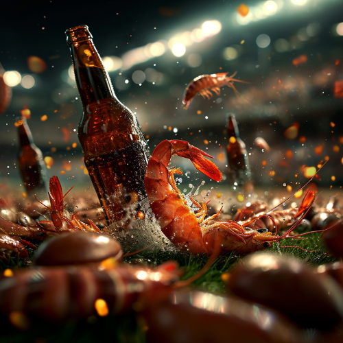 an American football stadium with two jumbo beer bottles as the field goal. Crowd is going crazy. Kicker is kicking a shrimp through the field goal. Wide angle shot. Night time game setting. --v 6.0 --s 250