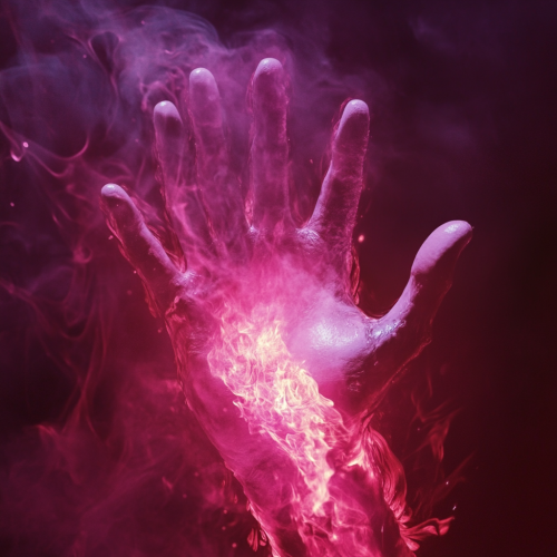 a hand with a burning hand in the middle, in the style of light red and dark magenta, fluid formation, photorealistic fantasies, intricate storytelling, distillation of forms, made of mist, chemical reactions --s 750