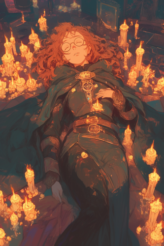 an image of a red headed woman with curly hair and glasses laying on the ground, surrounded by dozens of candles burning and melting, in the style of studio ghibli dungeon meshi --niji 6 --stylize 250 --ar 2:3