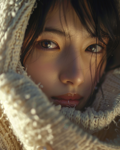 High-definition 4K close-up of a Japanese girl in a soft, white long cardigan, gentle texture, face illuminated by soft, ambient light. Slight tilt to her head, with warm sunlight adding depth, cardigan fabric and skin tones captured in vivid detail. Shot with Canon 5D Mark IV, fashion editorial finish, hd quality, cinematic focus --ar 4:5 --v 6.0