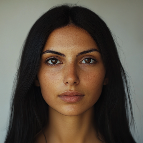 A hyper-realistic photograph of a 28-year-old woman with black hair, medium build, shown from head to toe, standing calmly and facing the camera directly. The woman has Middle Eastern features, with warm-toned, smooth skin, thick, lustrous dark hair, and intense, expressive eyes. The lighting is soft, highlighting the smoothness and natural glow of her skin, and the rich texture of her hair, Fujifilm X-T4, 56mm lens, f/2.8 aperture, extreme realism in skin and hair textures --style raw