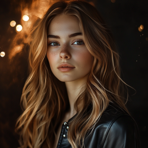Create a surreal portrait of a young woman with long, slightly wavy, light brown hair with blonde highlights, wearing a grey leather jacket. Her face is oval-shaped with a gentle, natural contour. She has hazel eyes with a warm, inviting gaze, framed by long, dark eyelashes and softly arched eyebrows. Her nose is straight and slightly narrow, adding to her refined look. She has full, naturally rosy lips that give a soft, confident expression. Her skin is fair with a smooth complexion, featuring a subtle glow. The background should be a blend of dreamlike, ethereal elements--like swirling nebulae or soft, misty forests--to add a sense of depth and mystery. The lighting should be soft and slightly dramatic, enhancing her features and creating an enchanting, otherworldly atmosphere. Include elements like floating feathers or shimmering light particles to blend realism with a surreal fantasy style.