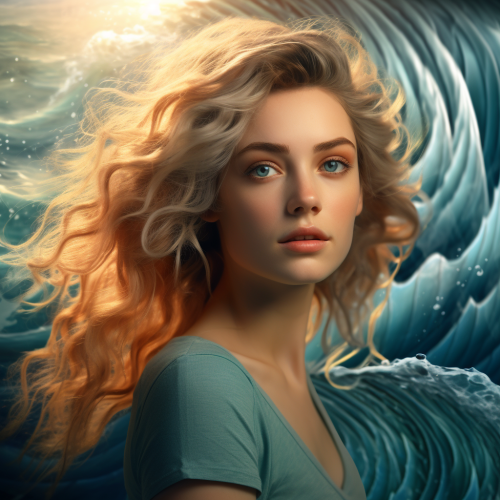 Beatuiful woman in waves, cinematic lighting, realistic skin, 8k, teal, big eyses, shells, portrait