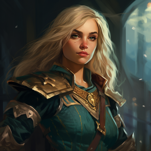 painted portrait of half elf female, golden blonde medium length straight hair, teal eyes, sharp facial features, wearing dark teal fantasy pirate clothes, lightning motif, d&d character art