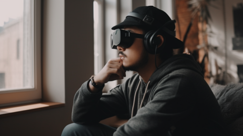 A young male videographer wearing DJI Goggles V3 and holding a Motion Controller 3, sitting in a luxurious Airbnb. He is intensely focused, capturing a scene with a sense of precision and professionalism. The setting is stylish and modern, with bright natural light streaming through large windows, emphasizing a relaxed yet professional atmosphere. Photorealistic, high detail, cinematic lighting, --ar 16:9 --v 5.0 --stylize 1000