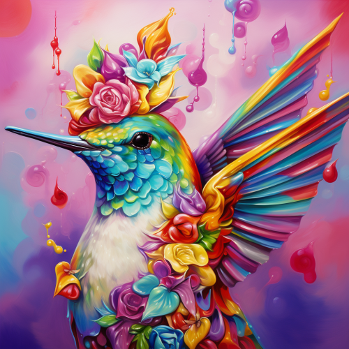 hummingbird with a unicorn horn, unicorn horn, horn on head, style of lisa Frank