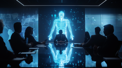 A boardroom meeting with business leaders and an ASI hologram, strategizing and making decisions based on predictive models and AI insights --ar 16:9 --v 6.0