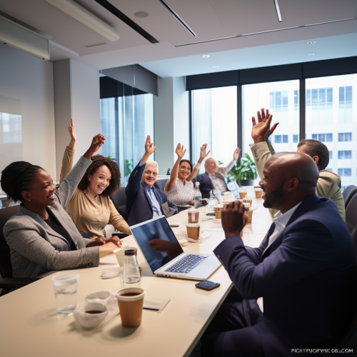 color photo of hotel sales winners in a grand hall, proudly holding their trophies, , The hotel sales winners, their smiles radiating with joy and accomplishment, , Their trophies gleaming in the grand hall's ambient lighting, a testament to their outstanding performance, , A majestic backdrop adorned with the hotel's branding and logo, setting the stage for this momentous occasion, , The atmosphere buzzing with excitement and admiration, colleagues and guests applauding their remarkable achievements