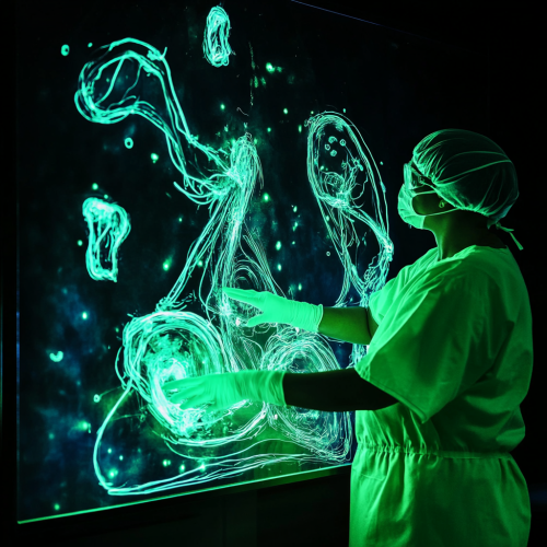 a bright neon sterile processing classroom, a sterile processing instructor wearing green scrubs is upfront teaching about steam sterilization, neon water drops, outline drawing, glowing colour, black background with neon nebula