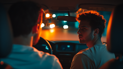 cinematic scene, A man in his 20s is sitting inside a driving school car, accompanied by a driving instructor, warm colors, cinematic lights, 4k --ar 16:9