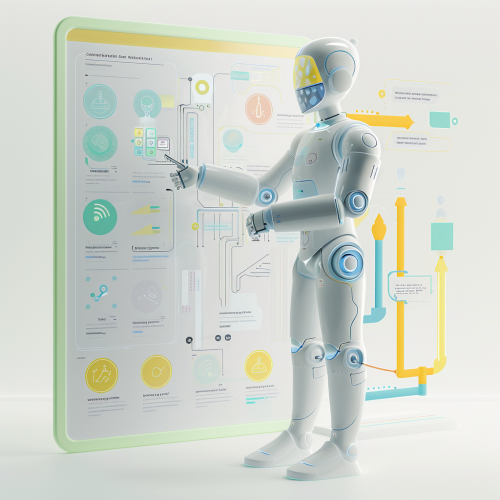 Modern infographic of a robot instructor using a holographic screen, pointing to sequential steps with icons, minimalistic design with soft, rounded shapes, pastel color theme with blue, green, and yellow accents, white background, emphasizing data flow and predictions with arrows --ar 1:1 --v 6.0