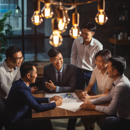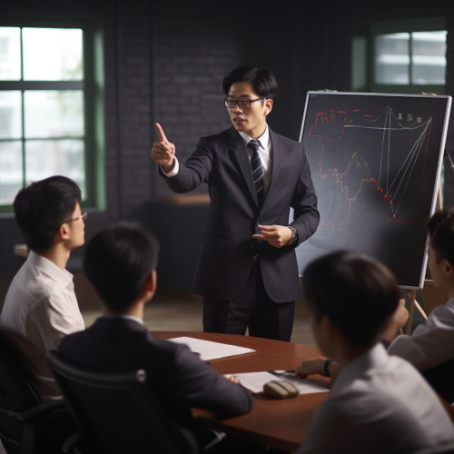 a Asian business man is teaching to a group, and have a lot of new idea while teaching