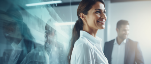 photo of business people looking into a screen, casual clothes, smiling, white theme, --ar 21:9