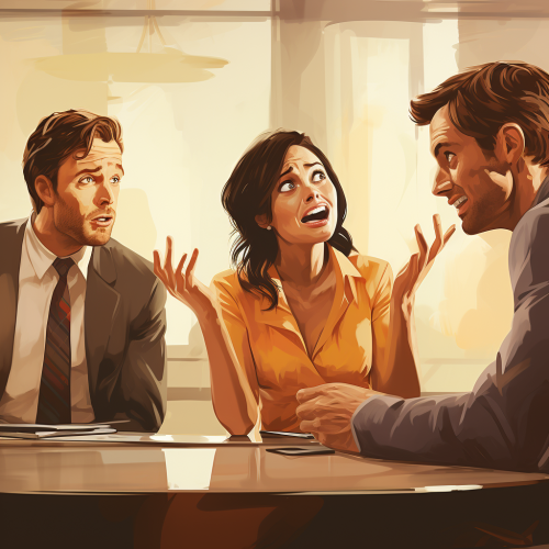 Corporate training scene. Three people in business casual attire are discussing business at a conference table. The man is happy while the women are upset. Their facial expressions are slightly exaggerated.