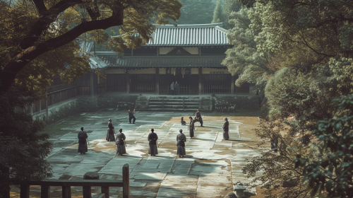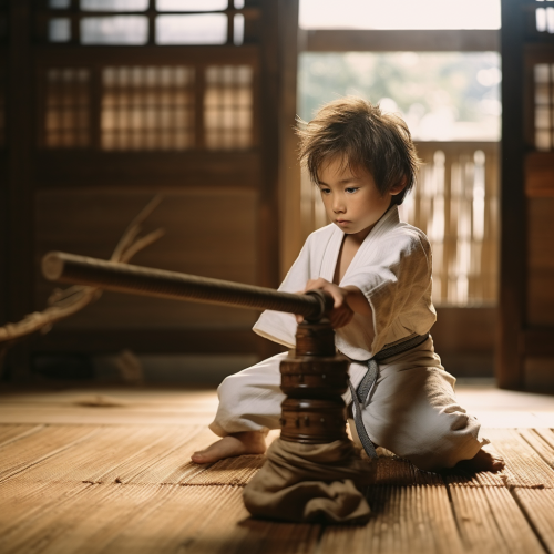 japanese boy hitting a wooden dummy with a wooden sword, training in dojo with master