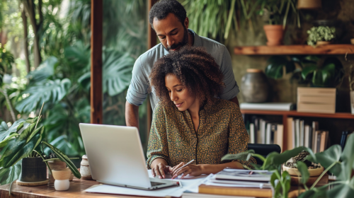 Photo of a man standing behind his wife who is sitting at a home office desk working on QuickBooks software. The man is helping her learn the software. --ar 16:9 --stylize 300 --style raw --v 6.0